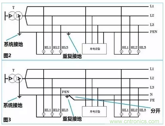 注意哦,圖2對(duì)應(yīng)的接地系統(tǒng)叫做TN-C,而圖3對(duì)應(yīng)的接地系統(tǒng)叫做TN-C-S。