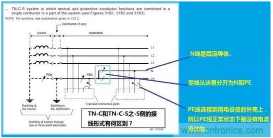 知曉這幾個(gè)概念后,我們來看看IEC給出的有關(guān)TN-C和TT系統(tǒng)的原圖。注意,這兩幅圖是不容置疑的,是有關(guān)接地系統(tǒng)的權(quán)威解釋。