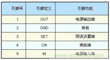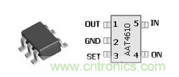 我們?nèi)砸訟AT4610為例,說明電子開關實現(xiàn)過流保護的工作原理。AAT4610采用SOT-23塑料封裝(如圖1),5個引腳的定義見表1。