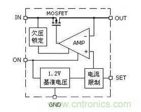 AAT4610將6V/2A的P溝道MOSFET場效應管與柵極驅(qū)動器、電壓基準、限流比較器和欠壓閉鎖電路組合在SOT-23-5封裝中(如圖2)。其中MOSFET是一個電子開關,它的通斷受比較器輸出電壓的控制,如果輸出電流大于設定電流,運算放大器AMP輸出負電壓,關斷MOSFET,停止電壓輸出,對供電電路起到保護作用。MOSFET的溝道電阻最大值僅為180mΩ,關斷模式下靜態(tài)電流為1mA。MOSFET的工作電壓為2.7V~5.5V,輸入電壓低于2.7V時,由欠壓鎖定電路關斷MOSFET,對供電電路進行欠壓保護。