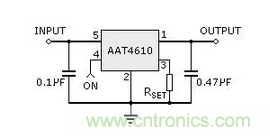AAT4610的應用電路十分簡單,只要外接兩只濾波電容和一只電阻器RSET,便可實現(xiàn)過流保護功能,如圖3。