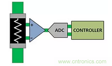 結合這些因素,針對電流監控的常用信號鏈配置會涉及到一個用于放大分流電阻器兩端電壓的模擬前端、一個將放大的電壓轉換為數字信號的ADC,以及一個系統控制器(圖 1)。