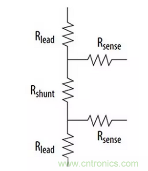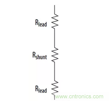 分流電阻器并不像其外表看起來那么簡單。具體而言,分流電阻器的電阻實際上由三個電阻組成(圖2)。首先,分流電阻器本身有電阻。其次,分流電阻器引線和分流電阻器連接的印刷電路板上的引線也有電阻。通常這些引線電阻不明顯,但是分流電阻器的電阻值通常非常低。在高電流測量中,即使很小的引線電阻也會引入測量誤差,因為制造商的分流電阻器電阻規格中并未考慮這些電阻。
