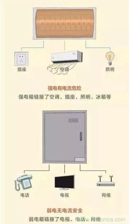 其中的強電是存在電流危險的,主要包括有空調、插座、照明、冰箱等;而弱電是沒有電流安全的,涵蓋了電視、電話、網絡。
