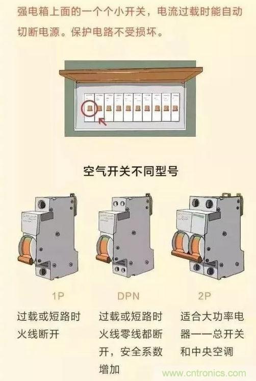 空氣開關是用來保護全家電路的,當我們的電流過大的時候會引發開關自動切斷電源。