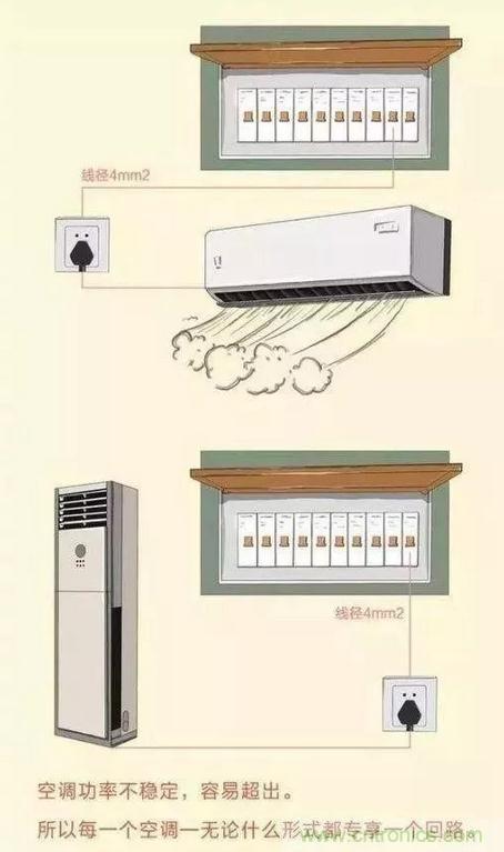 家裝中的空調一般都是單獨的線路,因為空調功率經常不穩定,容易出現超載的可能,因此每個可調都配有一個回路。