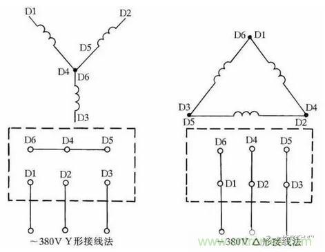 一般常用三相交流電動機接線架上都引出6個接線柱,當(dāng)電動機銘牌上標(biāo)為Y形接法時,D6、D4、D5相連接,D1~D3接電源;為△形接法時,D6與D1連接,D4與D2連接,D5與D3連接,然后D1~D3接電源。可參見圖1所示連接方法連接。