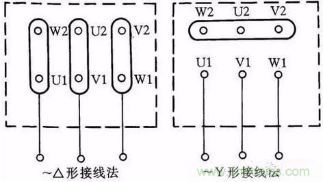 目前,Y系列電動機被廣泛應(yīng)用。Y系列電動機具有體積小、外形美觀、節(jié)電等優(yōu)點。它的接線方式有兩種:一種為△形,它的接線端子W2與U1相連,U2與V1相連,V2與W1相連,然后接電源;另一種為Y形,接線端子W2、U2、V2相連接,其余3個接線端子U1、V1、W1接電源。接線見圖6。