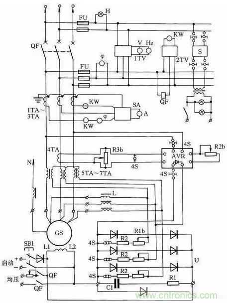 HF-4-81系列發(fā)電機控制線路如圖15所示,它與T2XV系列小型三相同步發(fā)電機配套。同步發(fā)電機的勵磁系統(tǒng)采用電復(fù)合相復(fù)勵調(diào)壓。發(fā)電機端電壓經(jīng)線性電抗器L移相,然后與發(fā)電機負(fù)荷電路中的電流互感器5TA~7TA二次電壓合成,經(jīng)三相橋式整流器整流后,供發(fā)電機GS勵磁自動調(diào)壓。