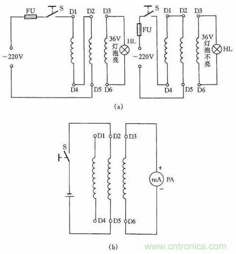 采用此法應(yīng)注意兩點:一是在接線前必須把行燈變壓器次級一端與殼體的連接線(保護(hù)接地線)拆除;二是要注意行燈變壓器的初、次級繞組的電流都不能超過各自的額定電流值。