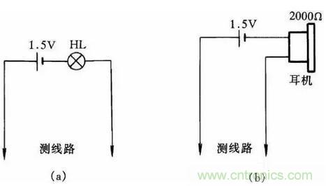 圖27(a)、(b)是最簡便的線路通斷檢測器。當(dāng)測得導(dǎo)線通路時,燈泡會發(fā)光,耳機在通斷瞬時會發(fā)響;當(dāng)線路斷路時,耳機不響,燈泡不亮。這種方法簡單易行,非常適合初學(xué)電工制作工具儀表或代替萬用表做測量,其優(yōu)點是攜帶方便。
