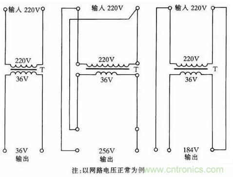 圖中的黑圓點表示繞組的同名端。如果將初、次級的連接線改為同名端相連;則輸出電壓將降低6.3V。采用這種接法;負(fù)載電流不得大于初、次級的額定電流。網(wǎng)路電壓如經(jīng)常比220V低(或高)30~40V;可選220V/36V的變壓器連接。