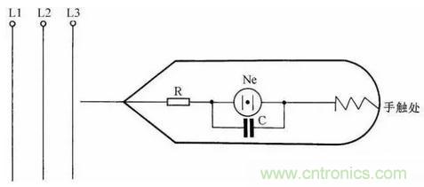 為了快速、準(zhǔn)確地判斷,可在一般的低壓驗電筆的氖泡上并聯(lián)一只1500pF小電容,這樣在測強電時,電筆照常發(fā)光。而測得的是感應(yīng)電時,感應(yīng)電會通過電容再經(jīng)過人體被大地吸收掉,所以電筆不發(fā)光。在自制這種驗電筆時應(yīng)把電筆上串聯(lián)的保護(hù)電阻放在測電筆線路的最前端以保障安全,見圖36。
