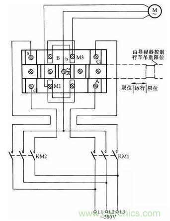 這里介紹一種常用限位器接線方法,這種限位器主要用于行車的上下電動機限位。當(dāng)?shù)蹉^高于限制位置時,它會使電動機自動斷開電源。這種方法一般是斷開主電機電源線,而不是用控制線控制接觸器通斷電動機停止限位,其優(yōu)點是萬一接觸器觸點熔在一起不能斷開時,限位器同樣能起到保護(hù)限位的作用。其接線方法如圖38所示。