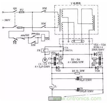 電路中VD1~VD4為4只硅整流二極管;R1~R4、C1~C4組成硅整流器件的過壓保護(hù)電路;FR為過流繼電器,保護(hù)硅整流器件。當(dāng)負(fù)載電流超過額定值時,電流互感器次級電流相應(yīng)增加,帶動繼電器FR動作,F(xiàn)R常閉觸點打開,接觸器KM釋放,觸點打開切斷電焊機電源。硅整流器件用0.25kW風(fēng)扇作風(fēng)冷設(shè)備。圖中,C5為濾波電容,R5為泄放電阻。