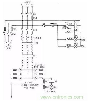 在電鍍過程中,常常利用硅整流器件的調(diào)壓電路進(jìn)行工作,其工作原理如圖41所示。當(dāng)需進(jìn)行工作時,按下按鈕SB1,接觸器KM1線圈通電,主回路中觸點閉合,線路輸出直流電壓。與此同時,KM2也得電動作,接通電扇,對硅整流器件以及調(diào)壓器吹冷風(fēng)降溫。線路中KI為過流繼電器。