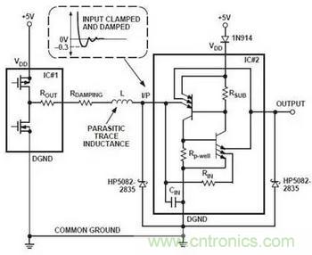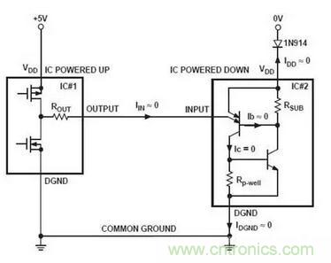 如果任何時候器件的數(shù)字輸入或輸出都超過VDD,可以在VDD串聯(lián)二極管(如下圖使用1N914)來阻止SCR觸發(fā)和隨后的閂鎖產(chǎn)生。這是因為二極管能夠防止寄生橫向PNP晶體管的基極電流從VDD引腳流出,從而防止SCR觸發(fā)
