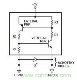 如果器件的數(shù)字輸入和輸出隨時低于DGND,那么從這些輸入或輸出連接到DGND的肖特基二極管將有效地將負偏移鉗位在-0.3V至-0.4V之間。 這可以防止寄生NPN晶體管的發(fā)射極與基極結(jié)導通,并且還可以防止SCR觸發(fā)。