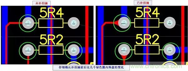 在電路板設計中,為了讓焊盤更堅固,防止機械制板時焊盤與導線之間斷開,常在焊盤和導線之間用銅膜布置一個過渡區,形狀像淚滴,故常稱做補淚滴( Teardrops )