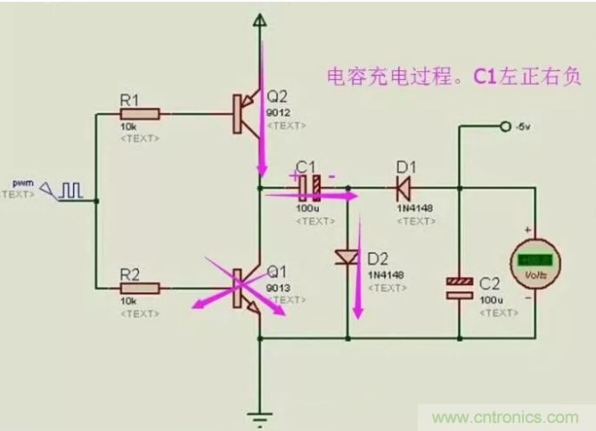 當(dāng)PWM為低電平時(shí),Q2關(guān)閉,Q1打開,C1開始放電,放電回路是C1-C2-D1,這實(shí)際上也是對(duì)C2進(jìn)行充電的過程。C2充好電后,下正上負(fù),如果VCC的電勢(shì)為5點(diǎn)幾伏,就可以輸出-5V的電壓了。