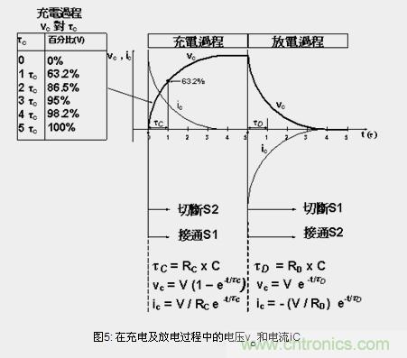 電阻值R和電容值C的乘積被稱為時間常數τ,這個常數描述電容的充電和放電速度,見圖5。
