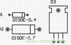 二極管的原理圖符號為“DIODE”,對應的二極管的封裝為封裝屬性系列,如“DIODE-0.4”(小功率)到“DIODE-0.7”(大功率),其中0.4和0.7指二極管的焊盤間距,一般用“DIODE0.4”。值得一提的是,普通的發光二極管的元器件封裝為“RB.1/.2”。