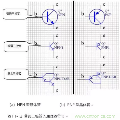 這兩種類型的晶體管外形完全相同,都包括3個引腳,即b(基極)、c(集電極)和e(發射極),但是其原理圖符號卻不一樣,如圖F1-12所示。三極管的原理圖符號的常用名稱有“NPN”、“NPN1” 和“PNP”、“PNP1”等。