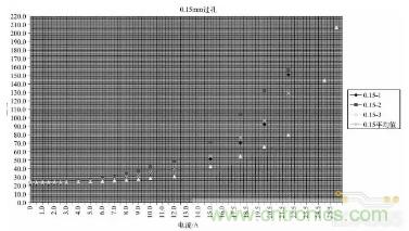 圖2 0.15mm孔徑的VIA溫升與電流的趨勢圖