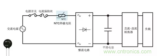 在簡單的直流電源電路(例如直流-直流轉換器)中,NTC熱敏電阻可用作電源熱敏電阻并有效地限制沖擊電流,而輸入和輸出電容在電源打開時即可開始充電。NTC熱敏電阻在通電后其電阻會大大降低,因此與使用固定電阻相比,其功率損耗更低。