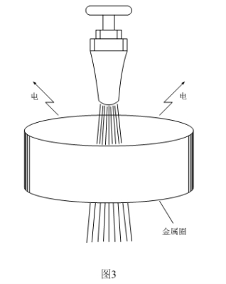 圖3是一個讓物體產生高壓電的原理圖,在水龍頭的下面安放一個用金屬薄片制作的圓圈(用金屬罐頭盒改制),金屬圓圈必須要與周圍絕緣,然后讓水龍頭流出的水正好從金屬圓圈的中央穿過,金屬圓圈很快就會帶電,并且電壓非常高,一般可達一萬伏以上。用試電筆做試驗時,當試電筆離金屬圓圈還很遠的地方,就可以看到試電筆被點亮,甚至拿一個小熒光燈靠近,也可以看得到熒光燈微亮。這說明電壓非常高,但對人體不存在被觸電的危險,因為金屬圓圈的電容量很小,存儲的能量有限。
