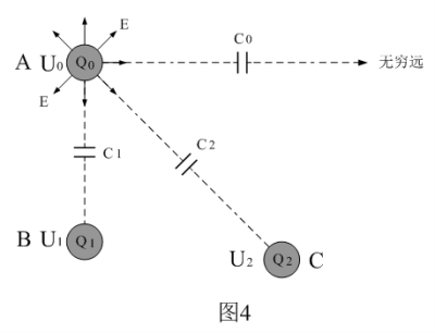 設:物體B和物體C沒受帶電物體A感應之前,所帶電荷以及對地電位均為零,則:電荷Q1和Q2,電壓U1和U2都是由于帶電物體A對物體B和物體C感應產生的電荷和電壓;U0越高,感應產生的U1和U2對地電位就越高,以及電荷Q1和Q2就越多,由此可求得: