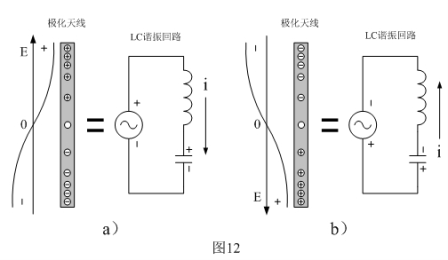 天線來回極化的工作原理可以等效成一個串聯諧振電路,當天線在電場力的作用下被極化帶電時,它又相當于一個電容在充電;當天線中的載流子在電場力的作用下來回移動時,它又相當于一個電感,并且在天線的周圍會產生磁場。