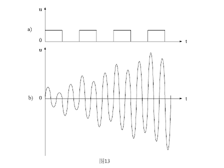 圖13是諧振回路產生諧振的工作原理圖。圖13-a)是一個含有諧波分量非常豐富的電壓方波,圖13-b)是LC串聯回路產生諧振時的電壓波形。當電壓方波作用于LC串聯回路時,方波的前后沿都會對LC串聯回路產生激勵(即接收能量),每次激勵過后又會產生阻尼振蕩(即損耗能量),當輸入電壓波形的上升率dv/dt值大于諧振回路波形(正弦波)的上升率時,電路就會產生激勵;當輸入電壓波形的上升率dv/dt值小于諧振回路波形的上升率時,電路就會產生阻尼。