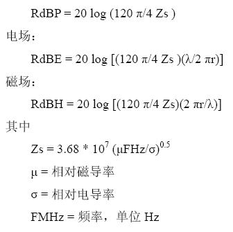 高阻抗源(電場)的波阻抗會(huì)大于120π 歐姆,而且它會(huì)隨著間隔距離的增大而逐漸減小,直到極限值。由此,有三個(gè)等式被用于計(jì)算屏蔽體表面的反射。這些等式假設(shè)Zw/Zs 或Zs/Zw >10。當(dāng)λ/2πr或2πr/λ=1 時(shí),電場和磁場等式就變得和平面波的等式一致了。