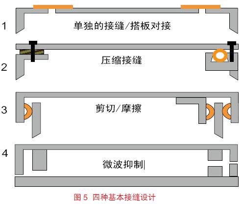 有四種不同構(gòu)造的接縫形式可供選擇,即(1) 單獨(dú)接縫,(2) 壓縮接縫,(3) 剪切或摩擦接縫,(4) 絕緣或阻塞抑制接縫。這些接縫的結(jié)構(gòu)如圖5 所示。最能夠代表單獨(dú)接縫的是搭板對(duì)接。示例中的頂部和底部接縫處于安裝在機(jī)架上的空白面板或活頁抽屜之間。因?yàn)闆]有交疊,所以很難應(yīng)用傳統(tǒng)的襯墊材料。此時(shí)傾向使用的密封方法是在接縫處使用帶背襯粘合的導(dǎo)電薄片或織物帶。