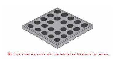 有的設計者更喜歡用表面安裝生產線的貼裝設備將蓋子和圍欄合為整體。只有在重新加工腔體內元件時才打開蓋子。選擇這種設計意味著蓋子上必須留有陣列小孔,以便熱量能進入腔體將內部的電子元件焊接在PCB上,如圖4所示。不幸的是,這些小孔會將腔體的屏蔽性能降低20dB左右。