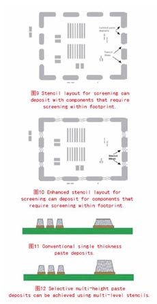 克服任何共面問題的另一手段是采用厚度經過選擇的印刷焊膏。在一個印刷通帶,為屏蔽腔選用增厚的焊膏和其他更大的元件,有助于消除元件共面的相關問題。這種技術提供了更結實的焊帶,增加了機械強度,有助于防止填料浮空的相關問題。