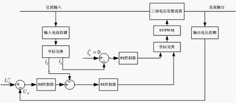 圖1為三相電壓型PWM整流器空間矢量控制框圖,它由主電路和控制回路兩部分組成。其中,控制回路主要由輸入電流和輸出電壓檢測、坐標(biāo)變換、PI控制器和SVPWM脈沖產(chǎn)生等部分組成。其原理如下:三相交流電通過三相電壓型整流電路整流為穩(wěn)定的直流電壓。同時,控制回路對主電路的輸入電流和輸出直流電壓進(jìn)行檢測,一方面,將檢測值與給定值進(jìn)行比較后送入PI控制調(diào)節(jié)器,輸出值與電流比較并將其輸出送入PI控制器變?yōu)殡妷盒盘枺俳?jīng)坐標(biāo)變換送入SVPWM脈沖產(chǎn)生單元,完成電壓閉環(huán)控制;另一方面,將檢測的輸入電流經(jīng)坐標(biāo)變換與給定電流比較,送入PI控制器變?yōu)殡妷盒盘枺俳?jīng)坐標(biāo)變換送入SVPWM脈沖產(chǎn)生單元,完成電流的閉環(huán)控制。矢量控制單元通過矢量運(yùn)算,生成所需要的PWM波,控制雙向變換器,達(dá)到輸出電壓的穩(wěn)定和輸入側(cè)交流電流的正弦化。