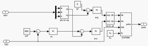 控制電路仿真模型如圖3所示。它主要由PI控制器模型、坐標(biāo)變換模型以及矢量控制器模型等部分組成。其中,坐標(biāo)變換和矢量控制器仿真模型的建立主要根據(jù)矢量控制原理搭建而成[2],其仿真模型如圖4所示。