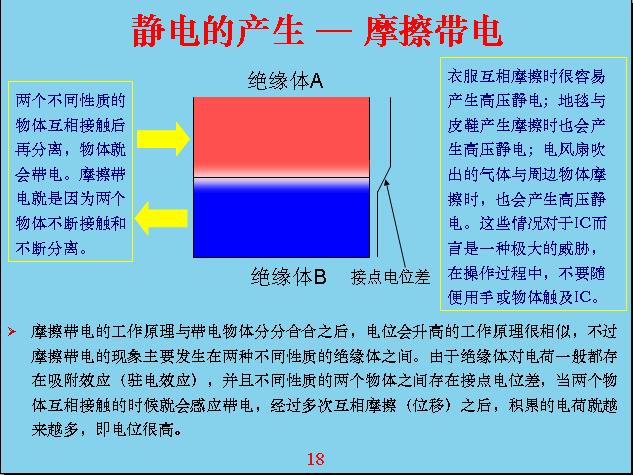舉一個具體的例子,比如說我現(xiàn)在這個人站在地上,我是光著腳,地板是導電的,這個椅子是絕緣的,我從地面一站到椅子上就相當于我?guī)щ娏恕槭裁矗恳驗槲以瓉硎菢O化帶電,上面帶負電,下面帶正電,我站在地上下面就變成零,上面變成了-100v,站上去的時候相對來說我就變成帶電的人。所以,很多在半導體車間或者和集成電路接觸、打交道的人,不要隨隨便便用人摸集成電路,因為你這個人不知不覺就帶電了,你從門外面走進房子里很可能就帶電了,在上樓梯或者地板鋪有一層絕緣的東西,在絕緣以外的時候你不帶電,站上去就帶電了,因為上面有電層。還有空調(diào)的風吹出來的空氣會和你身體上面的衣服進行摩擦、感應,它容易帶電,用靜電筆來測,隨便碰衣服或頭發(fā),上面帶的電基本上都有300v左右,如果摩擦幾下大概就有4000-5000v,所以靜電感應是相當厲害的,很多模型電路在送到工廠的時候就是用盒子包裝,因為盒子是導電的,如果用電表去量它好像沒有電阻,電阻是無窮大,其實它是導電的,相對來說電導率很低,也就是電阻很大。