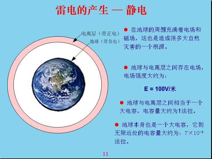 為什么會產(chǎn)生雷電?可能大部分人都不知道,我在這里就給大家講解一下雷電是怎么產(chǎn)生的。雷電是由于電磁場產(chǎn)生的,世界上什么電都是通過電磁場反應產(chǎn)生的。為什么會產(chǎn)生雷電呢?因為在離地球30公里外有一個電離層,電離層實際上就是最外的空氣受到太陽光、紫外線照射而產(chǎn)生電離,太陽光實際上也是一種電磁波,電磁波的作用相當于我們把一個食物放在微波爐里面加熱,原理是差不多的,但是微波的波長線很長,紫外線相當短,所以作用不一樣,用微波爐不能把空氣進行電離,只有紫外線能夠電離。被電離以后會分成兩層,一層帶正電,一層帶負電,與地球相對的一層帶正電,地球就是帶負電。地球是一個圓的,帶電的話相當于電層強度是散發(fā)性的,越靠近地球電容強度越高,靠近地球表面是100v,也就是說一米高的位置電容強度是100v電容強度就是用這個來表示,大家在中學里面很少用電位梯度的概念表達電容強度,后面我們在工作中還是用電位梯度來表示電容強度是最合適的,比如靈敏度、多少毫伏米都是屬于電感強度。以前是用牛頓的力學來表達,那個概念相對來說比較難理解,兩個帶電物體之間產(chǎn)生多少牛頓力的時候,換算成單位來表示電容強度,這個強度不太好理解,如果用電位梯度表示就很方便了。