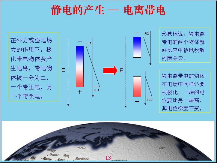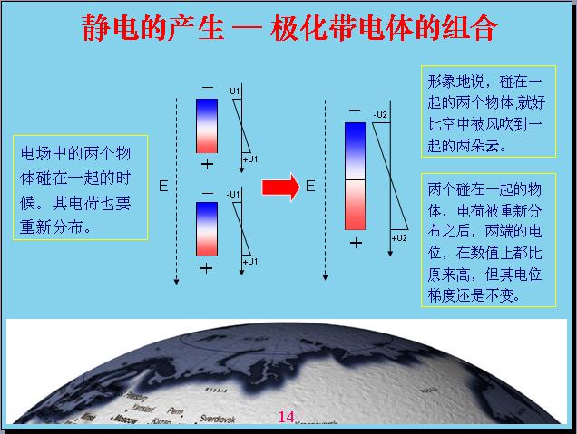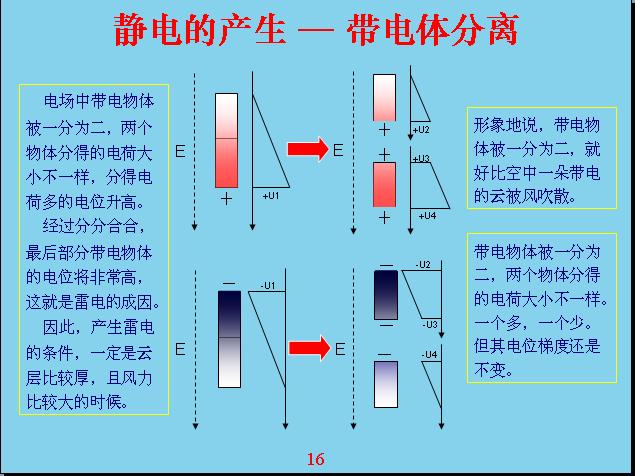 由于地球是帶電的,相對電容層來說。一個物體在地球空間里面就會受到電場的作用產(chǎn)生極化,什么叫極化?就是說一個物體原來是不帶電的,現(xiàn)在產(chǎn)生極化帶電,一端帶正電,一端帶負電。比如說這個源相當于一個導體,如果底下是絕緣的話,上面如果沒有屏蔽,我的上面就帶負電,下面帶正電,中間這個地方是不帶電的,人相對來說還是偏中性,但是雖然極化帶電的,但我總得來說還是變中性,帶的正電和負電都是相等的。如果把原來極化帶電的物體分成兩個,這兩個都會帶電。形象地說,一朵云在電場作用下極化帶電,但沒有產(chǎn)品電流,電感強度沒有達到這么高,如果把它分成兩塊就會產(chǎn)生電容帶電。現(xiàn)在由于風的作用,把它一吹變成兩塊,中間的地方分成兩塊,有一塊相當于帶負電,有一塊帶正電。這就表示電位曲線,中間這個地方表示電位反映,上面帶負電,下面帶正電,這個幅度越高表示帶電幅度也越高。這個沒有帶正電,那個沒有帶負電,電容性就破壞了,相對來說是帶負電,這個帶正電的。云帶電就是因為這樣產(chǎn)生的。