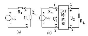 式中,P1和U1分別表示當(dāng)EMI濾波器未插入前(圖1(a)),從噪聲源us傳遞到負(fù)載RL的功率和電壓;P2和U2分別表示當(dāng)EMI濾波器接入后(圖1(b)),從噪聲源傳遞到負(fù)載的功率和電壓。