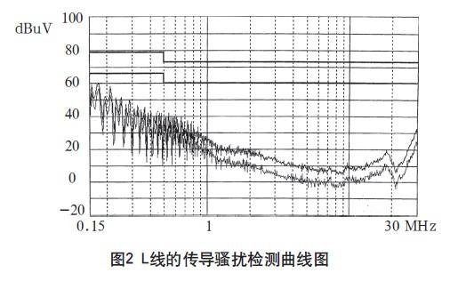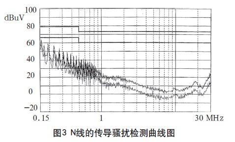 在3m法電波暗室對(duì)試驗(yàn)樣機(jī)進(jìn)行測(cè)試,其L、N線的傳導(dǎo)騷擾檢測(cè)曲線如圖2、3所示,輻射騷擾的垂直極化掃描曲線如圖4、5所示。