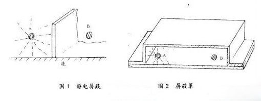 屏蔽方法:將一塊金屬板置于兩個被屏蔽的電路中間,并使各金屬板與地作電氣連接,如圖1所示。這樣從一點發(fā)出的電力線均被屏蔽板擋住,即起到靜電屏蔽作用。