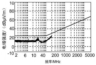對RE102 試驗(yàn)項(xiàng)目進(jìn)行觀察,發(fā)現(xiàn)測試結(jié)果圖的超標(biāo)點(diǎn)為24 MHz、36 MHz 兩點(diǎn),而這兩點(diǎn)分別是12 MHz 頻率點(diǎn)的二三次諧波。為了找到這一頻率點(diǎn)的元器件,對機(jī)箱內(nèi)各單元進(jìn)行了分析,發(fā)現(xiàn)控制保護(hù)單元中有一個(gè)12MHz 晶振,由于晶振屬于高噪聲元器件,能夠產(chǎn)生較強(qiáng)的輻射,從而使其周邊充滿著近場輻射場。如果輻射場內(nèi)有器件或走線,晶振及其諧波信號將耦合到器件或走線上而輻射出去;再者又發(fā)現(xiàn)控制保護(hù)單元的PCB 板未采取就近接地措施,只是通過一根長引線和機(jī)殼地相連,造成信號的環(huán)路面積增大,產(chǎn)生了很強(qiáng)的輻射,所以對控制保護(hù)單元采取措施應(yīng)該是行之有效的。首先對晶振進(jìn)行屏蔽且屏蔽體就近接地,弱化輻射發(fā)射強(qiáng)度; 然后控制保護(hù)單元的PCB 板同樣采取就近接地措施,并且在屏蔽盒出口處的信號線上安裝一個(gè)鐵氧體磁環(huán),可以將不需要的高頻干擾抑制掉。通過采取以上措施后,RE102 試驗(yàn)指標(biāo)合格,如圖3 所示。