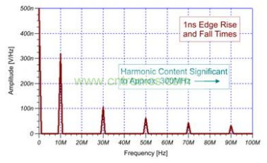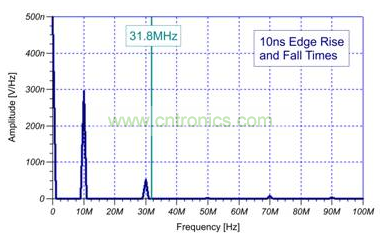 10 ns 邊緣率時方程式結果為約 31.8 MHz。曲線圖顯示,最后一次明顯諧波出現在30 MHz。同時,圖 2 所示 1 ns 邊緣率時方程式結果為 318 MHz 最大頻率。如果您的電路易受 318 MHz 頻帶內產生的頻率影響,則 EMI 諧波可能會使您的電路出現干擾。
