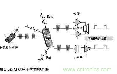 當(dāng)手機(jī)與基站通訊,或兩個(gè)手機(jī)彼此接近時(shí),發(fā)射脈沖通過(guò)擴(kuò)音器,揚(yáng)聲器,或頭戴式耳機(jī)線傳人音頻通路。見(jiàn)圖5。結(jié)果是音頻質(zhì)量大幅降低。