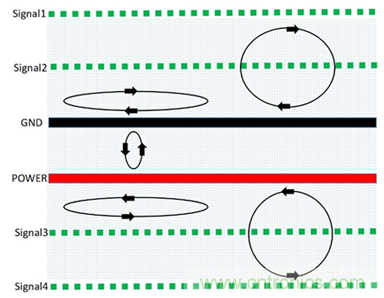 PCB疊層EMC規(guī)劃與設(shè)計(jì)思路的核心就是合理規(guī)劃信號(hào)回流路徑,盡可能減小信號(hào)從單板鏡像層的回流面積,使得磁通對(duì)消或最小化。