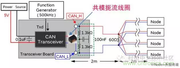 CAN要求通信質量有很高的可靠性,特別是對可靠性產生影響的電磁噪聲。為了電磁噪聲問題不對汽車內部使用的無線通信等產生影響,除必須抑制噪聲的發生外,對于從周圍混入的噪聲,為保證通信質量,也要求要保持高度的耐性。例如,放射噪聲中,信號頻率250kHz(或500kHz)的高頻噪聲在高水平下能夠被放射到數十MHz帶域。